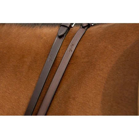 Rênes en caoutchouc et en cuir vachette avec élastique intégré à l'extrémité vers la bouche du cheval.