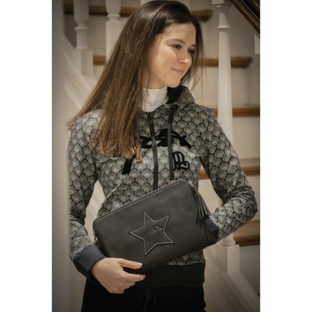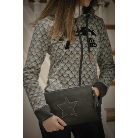 Fermeture zip noire, et logo Pénélope en noir au centre du sweat.