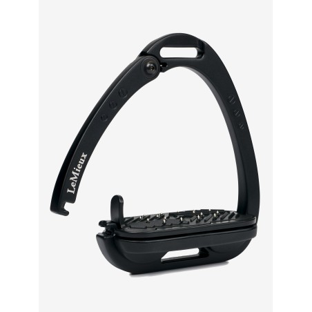 Un bras articulé intégré est doté d'un système de déverrouillage en deux temps, empêchant toute ouverture involontaire. Le bras à ressort se verrouille à la base du cadre principal, ce qui signifie qu'en cas de pression maximale, comme lors de l'atterrissage sur une barrière, le poids du cavalier est réparti uniformément sur l'étrier, empêchant l'extérieur de s'affaisser et de fléchir. Lorsqu'une pression est exercée sur le bras de l'étrier, le bras se libère, ce qui permet au pied de sortir de l'étrier et minimise le risque de blocage. La force d'ouverture du bras de l'étrier est de 36N (équivalent à 3,62kg) lors des tests, ce qui signifie une résistance suffisante pour empêcher l'ouverture involontaire de l'étrier, mais qui se relâche en cas de besoin.