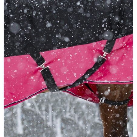Equipée d'un très grand rabat de queue imperméable avec bande réfléchissante intégrée, d'un pad de garrot en mouton synthétique à l'intérieur de la couverture, de sursangles croisées basses et de courroies de cuisses.