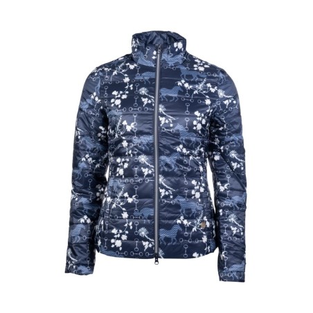 La veste matelassée bleu foncé Bloomsbury est entièrement décorée d'un motif à la mode composé de fleurs blanches, de chevaux au galop et de mors disposés.