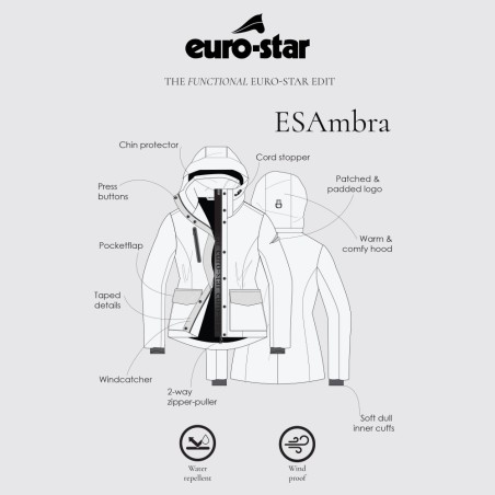 Découvrez l'alliance parfaite entre performance technique et style sophistiqué avec la veste ES-Ambra. Conçue pour les cavaliers passionnés qui recherchent constamment l'excellence, cette veste de la ligne premium d'euro-star conjugue innovation, performance et raffinement. Sa finition déperlante sans fluor vous protège des intempéries pendant vos séances d'entraînement ou vos compétitions. Grâce aux coutures étanches et à son coupe-vent intégré, elle offre une protection optimale peu importe les conditions météo. La fermeture éclair à double curseur et les boutons-pression élégants vous permettent d'adapter facilement votre confort tout en restant élégant(e) en toutes circonstances. Finalement, le logo en caoutchouc surélevé souligne subtilement l'exclusivité de cette pièce incontournable.