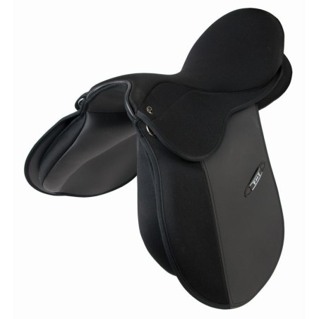 Ultra légère: moins de 4kg, arçon synthétique léger. Très confortable, sans entretien, taquets réglables par bandes auto-agrippantes, pommeau nez coupé pour s'adapter à tous les chevaux, sanglons cuir au chrome avec omelettes.