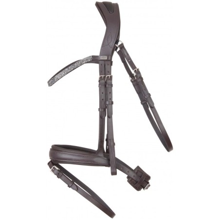 Bridon à la têtière reculée et large afin de dégager les oreilles et répartir les pressions au niveau de la nuque.
