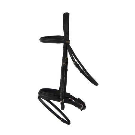 La muserolle est de type pull back permettant ainsi un meilleur ajustement à la tête du cheval. Le frontal est cintré afin de mieux couvrir le front.