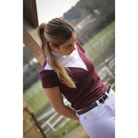 Turnierpolo mit kurzen Ärmeln und Baumwollkragen. Schließt mit einer leicht nach links versetzten Leiste. Verdeckte Knopfleiste mit drei Knöpfen. Lurex-Paspelierung um den Kragen. Das Logo ist auf der Brust mit Lurexfaden gestickt. Bei dem Modell im Matrosenstreifen-Look sind die kurzen Ärmel aus uni weißem Stoff.