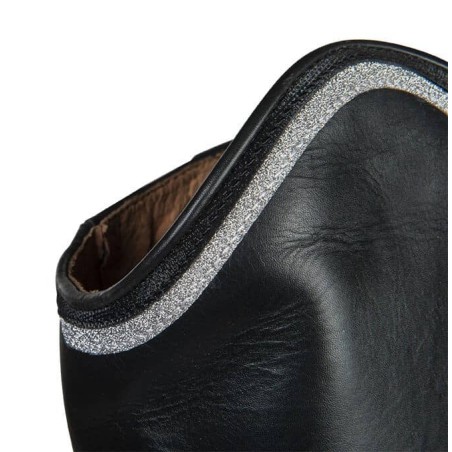 Klassischer Lederreitstiefel für Damen, der am Schaft mit einem Glitzerbogen abgeschlossen wurde. Der Reißverschluss befindet sich hinten am Stiefel und kann mit einem Druckknopf gesichert werden, an der Vorderseite befindet sich eine modische Schnellschnürung.