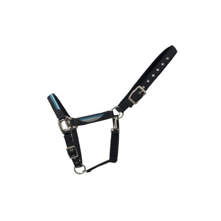 Fleece-gefüttertes Halfter an Nasenriemen, Genickstück und Pfosten, Karabinerhaken zum Putzen, sehr schöne Verarbeitung, satinierte Schnallen.
