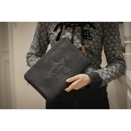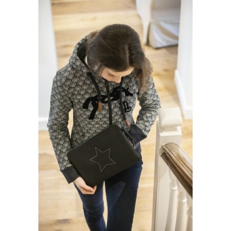 Motivos blancos sobre fondo negro, dos bolsillos.