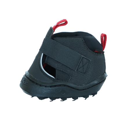 Este modelo puede ser adecuado para caballos con un paso lateral pronunciado. Buen ajuste: Gracias a su parte superior adaptable y al sistema de cierre, la sandalia puede colocarse firmemente alrededor del casco para un buen ajuste.