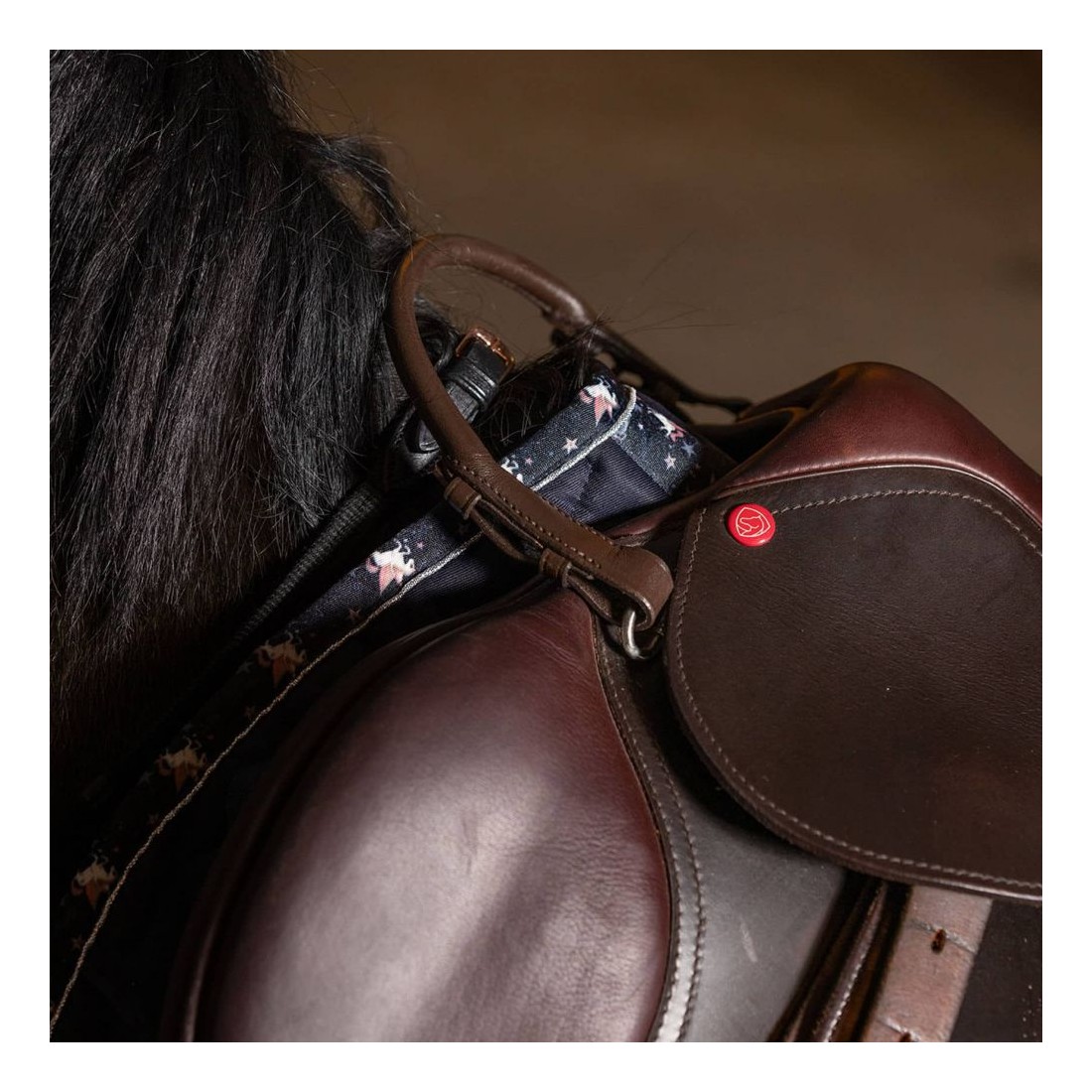 La maniglia permette al cavaliere di stabilizzarsi durante le transizioni o i movimenti difficili, senza esercitare una pressione eccessiva sulla schiena del cavallo. Il suo design discreto e le sue finiture curate si integrano elegantemente nella selleria. È un complemento semplice ma utile per chi cerca un maggiore controllo e sicurezza in sella.