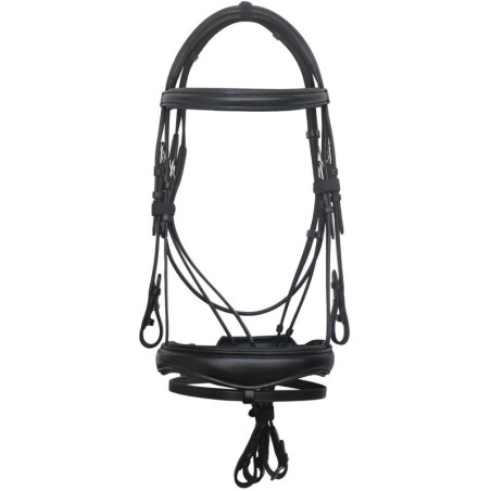 Le cuciture sono in tinta con il colore della pelle e danno un tocco di sobrietà. Le chiusure a gancio e il nasello a strappo rendono questa briglia ideale per una sessione di dressage.