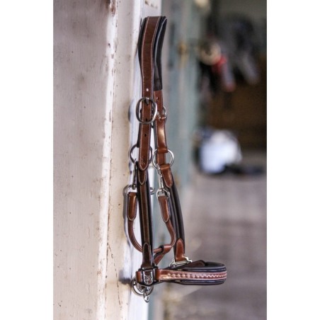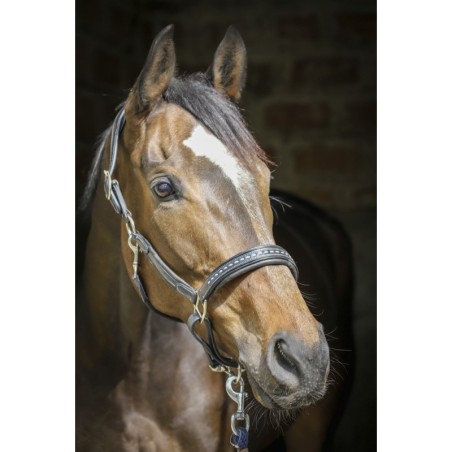 Het leren halster heeft een gevoerd anatomisch kopstuk met een verstelgesp aan elke kant.
