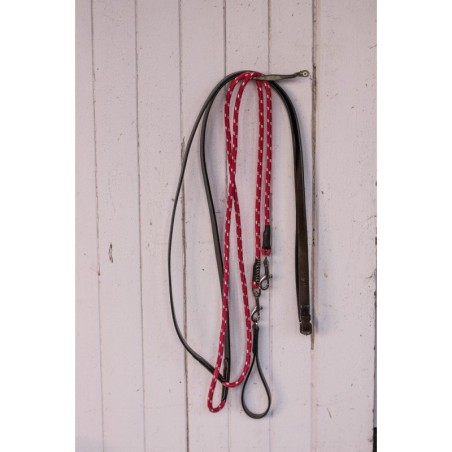 Duitse teugels van glad leer/roze touw met dubbele karabijnhaak.